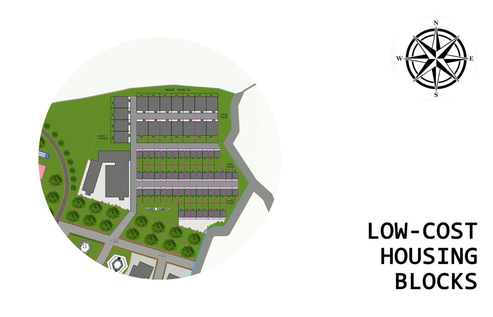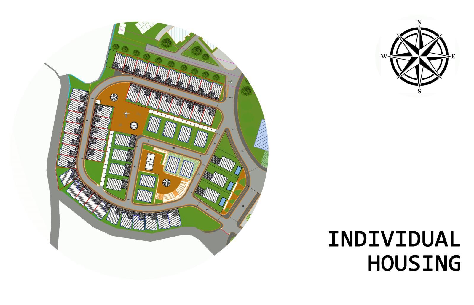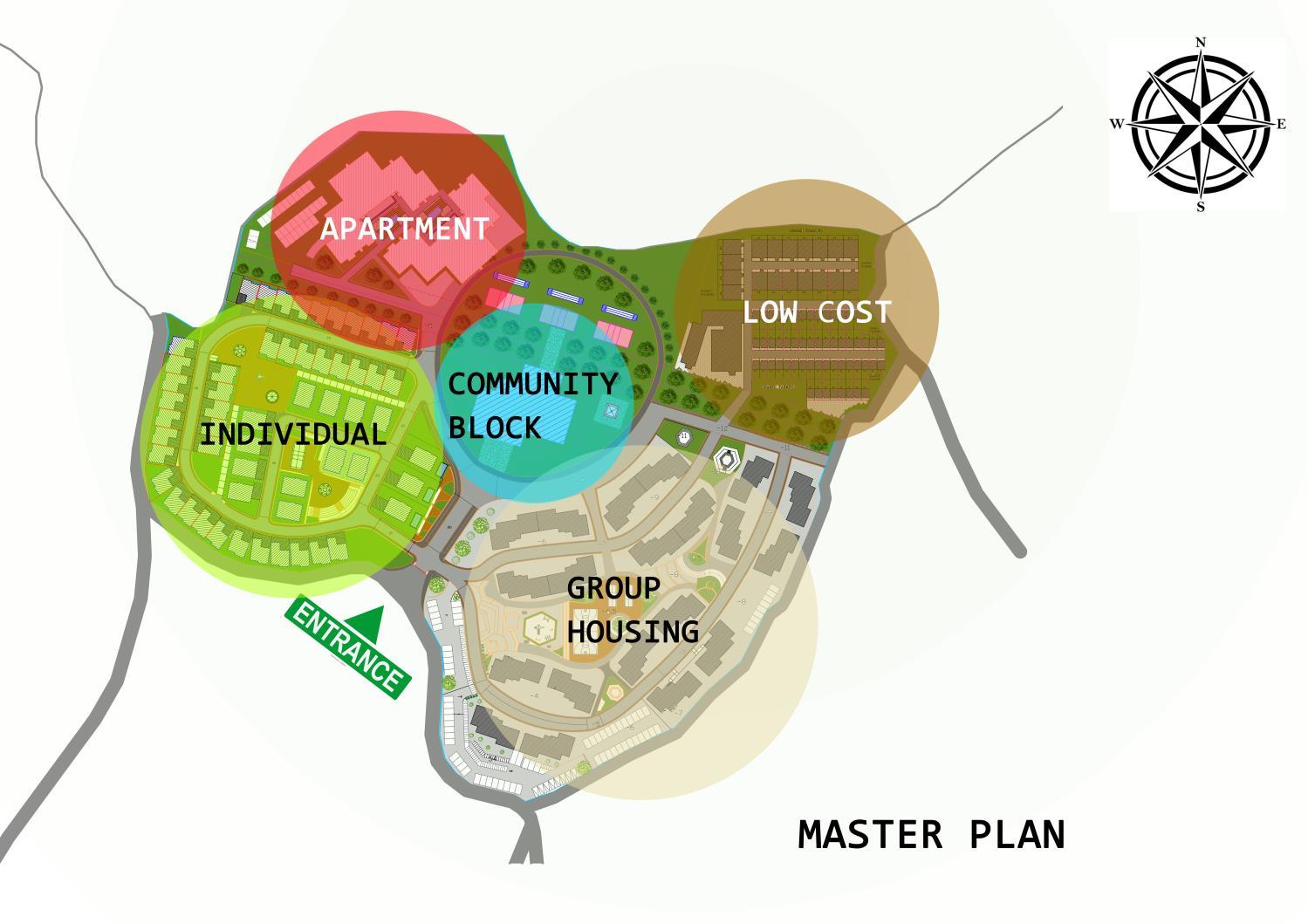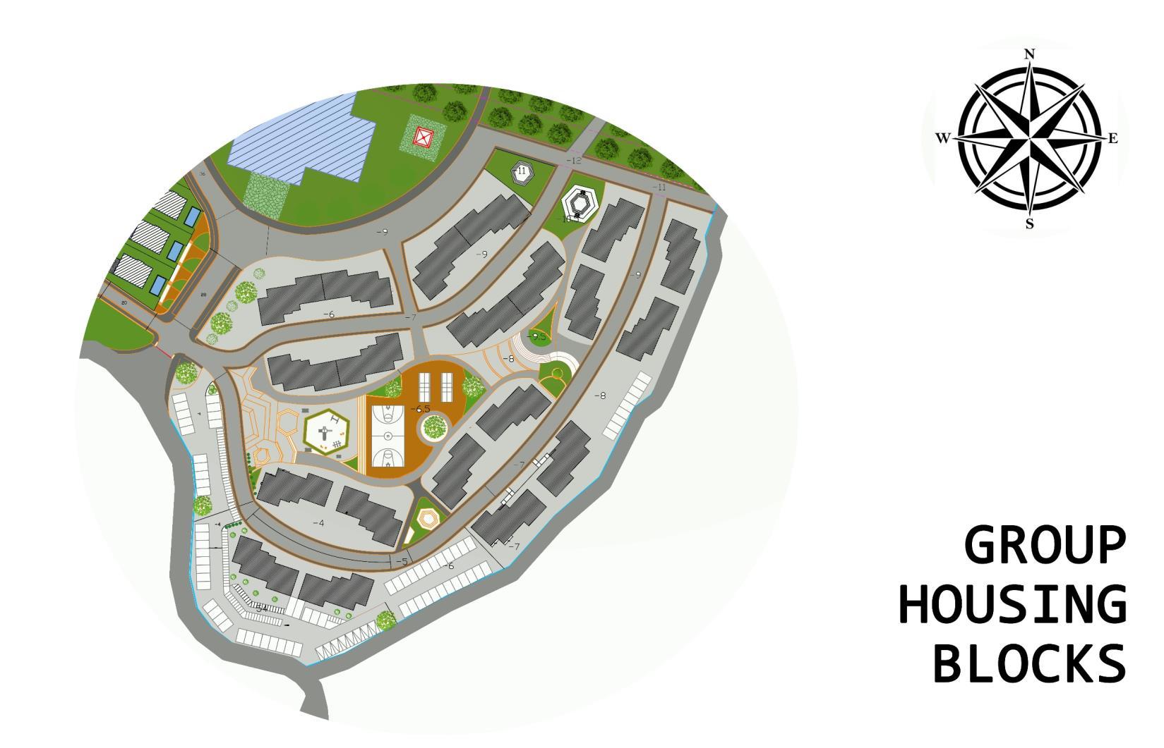 - Five housing clusters arranged around shared courtyards and central green zones.