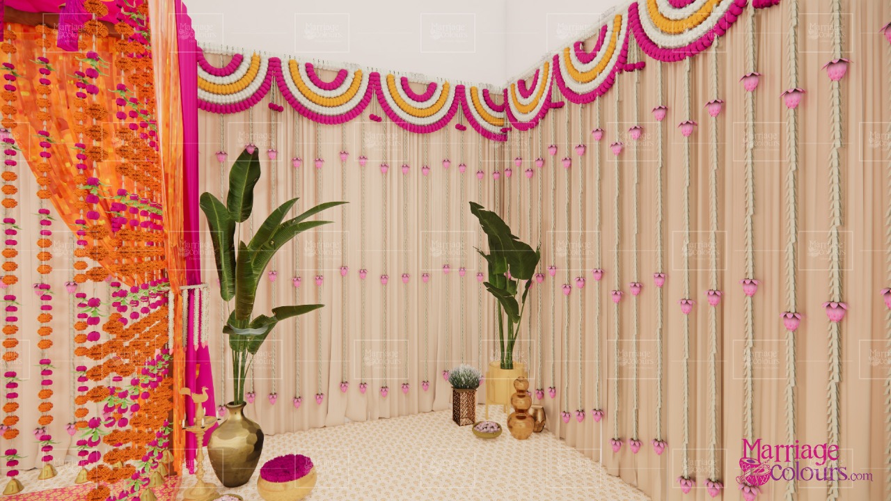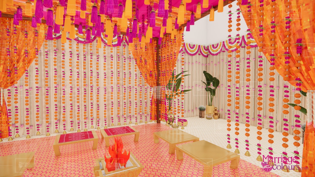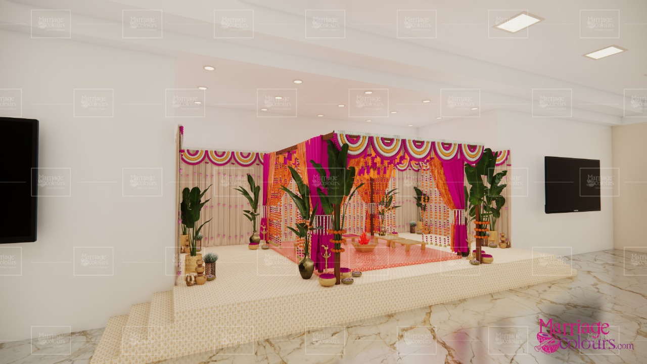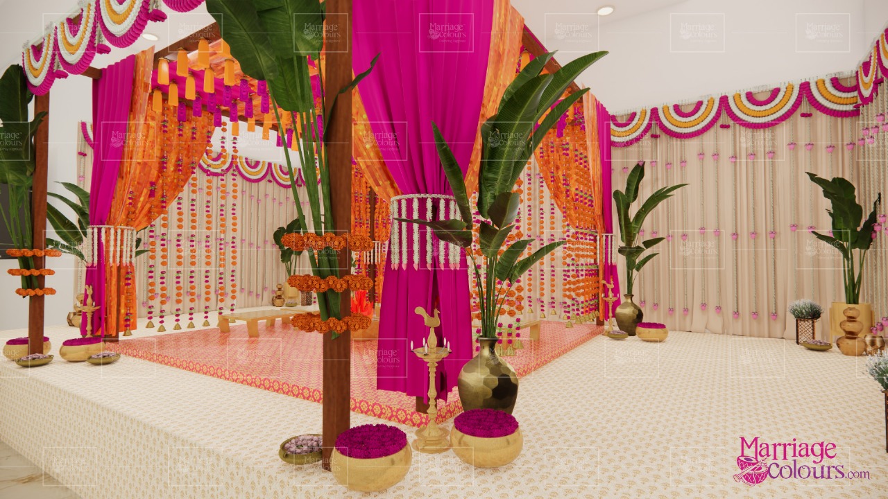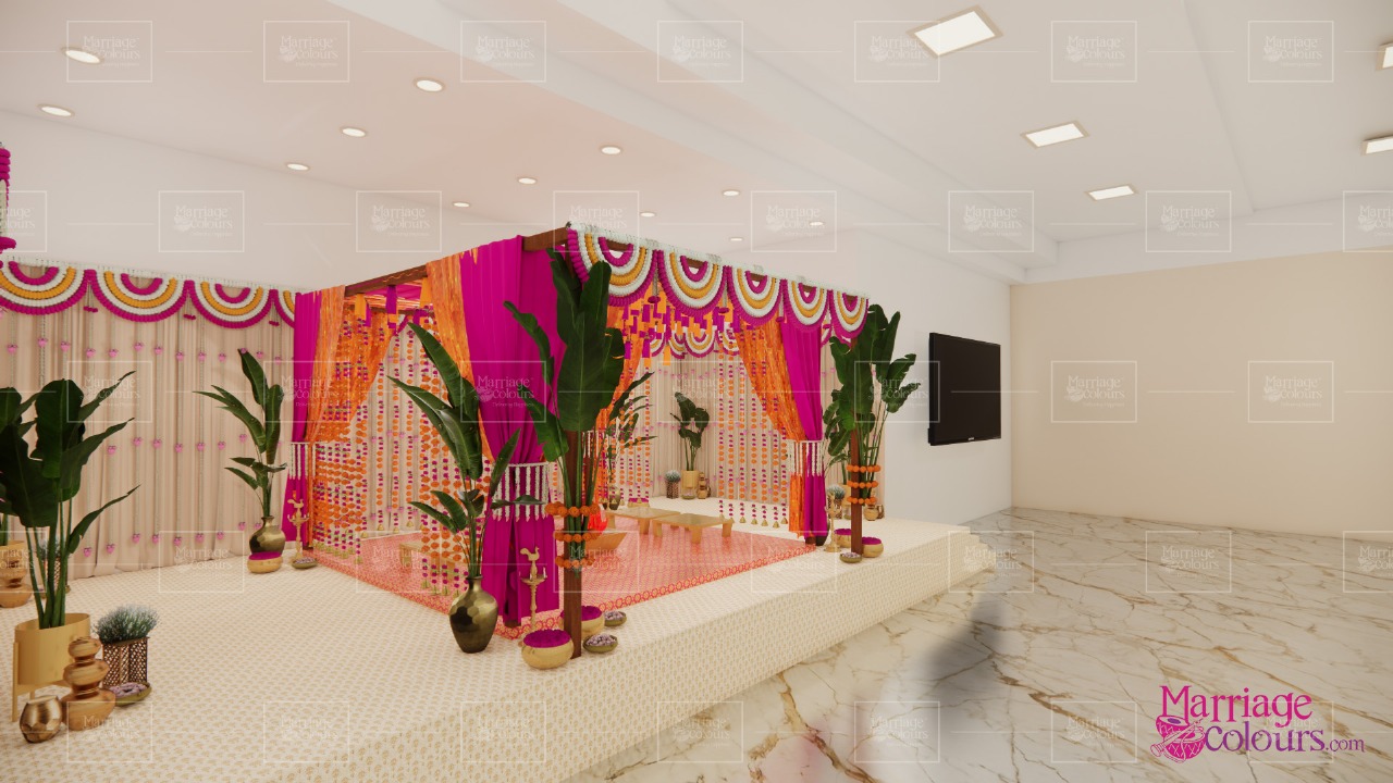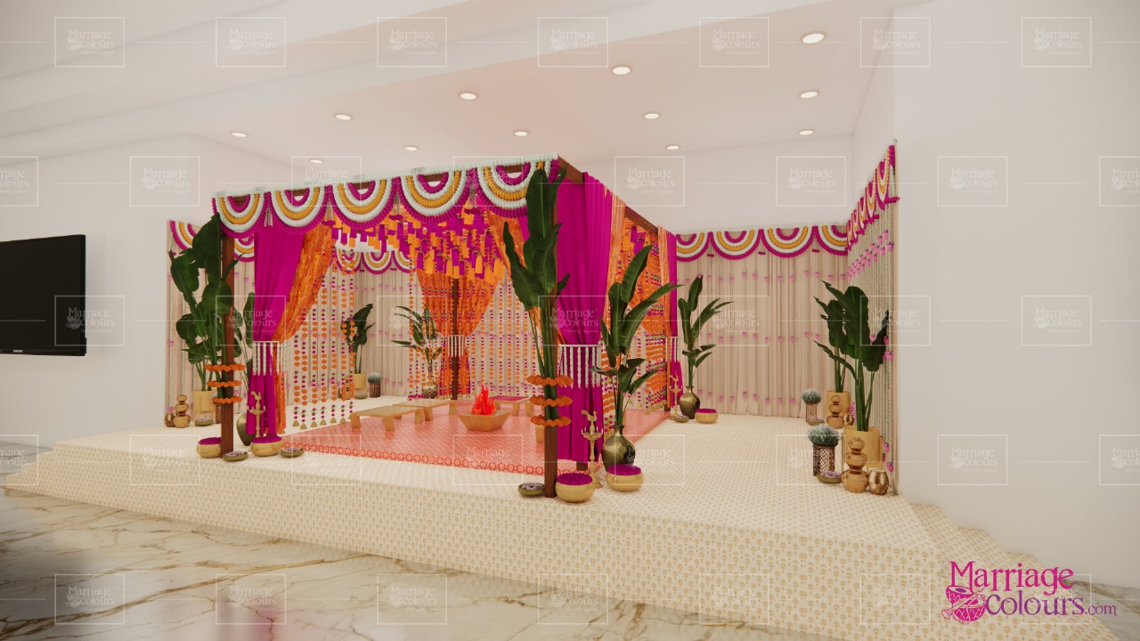A vibrant indoor mandap setup designed for an intimate traditional ceremony. The palette of fuchsia pink, saffron orange, and gold conveyed festivity, warmth, and sacredness.