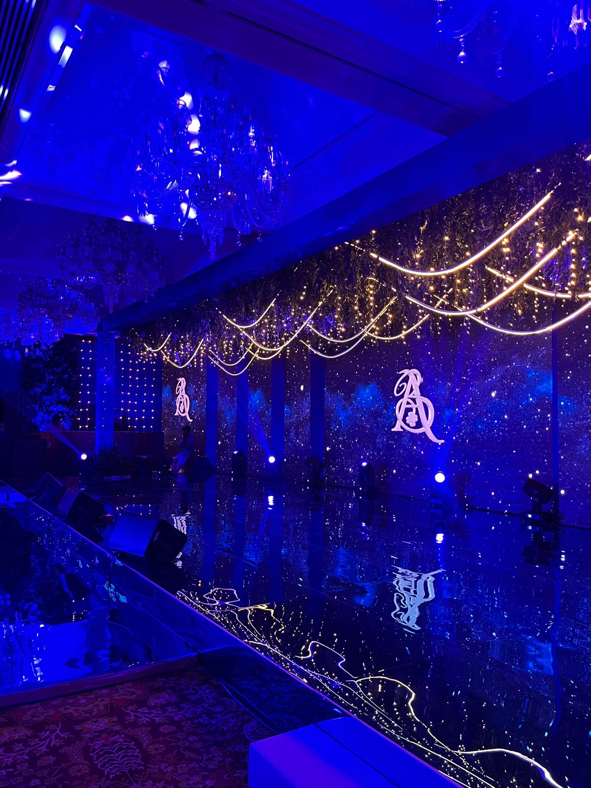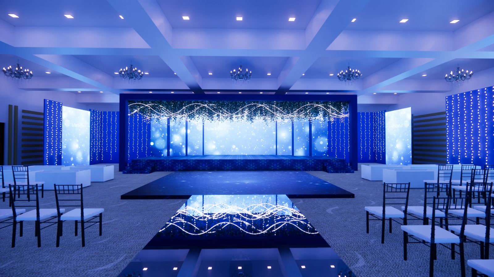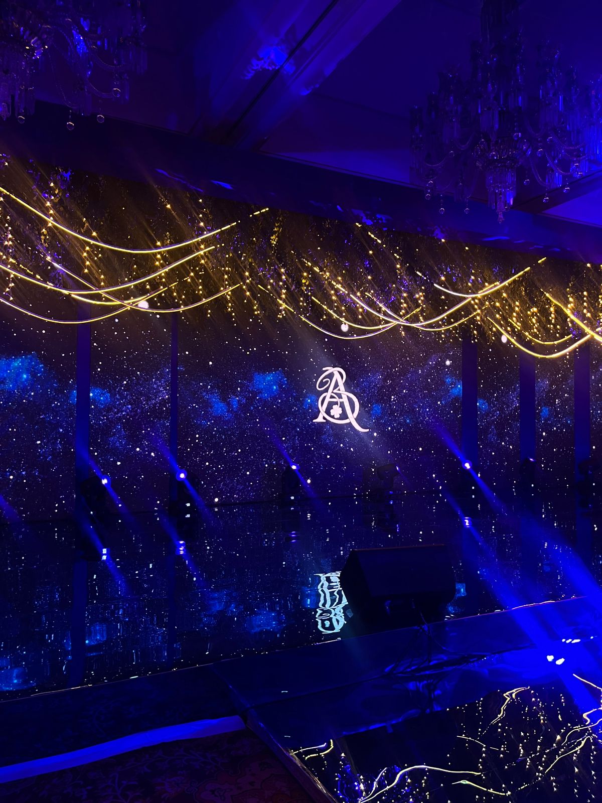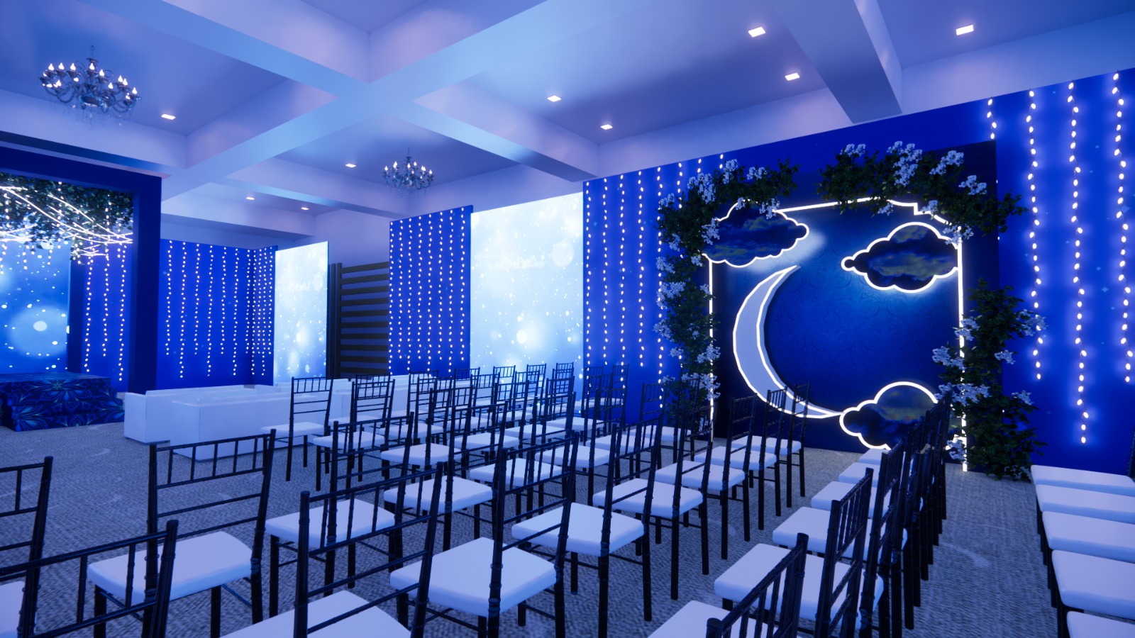 A complete venue transformation for a Sangeet celebration, designed around the poetic and immersive concept of a “Starry Night.” The design narrative focused on dissolving the spatial boundaries of a typical event hall, replacing them with a dynamic, atmospheric environment.