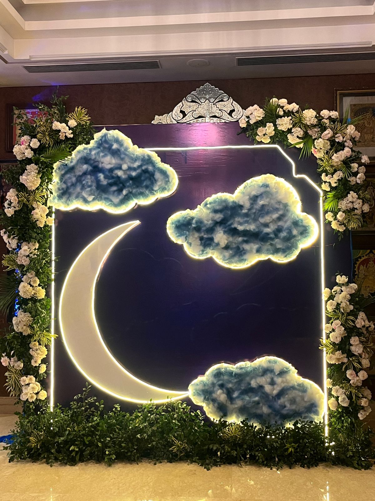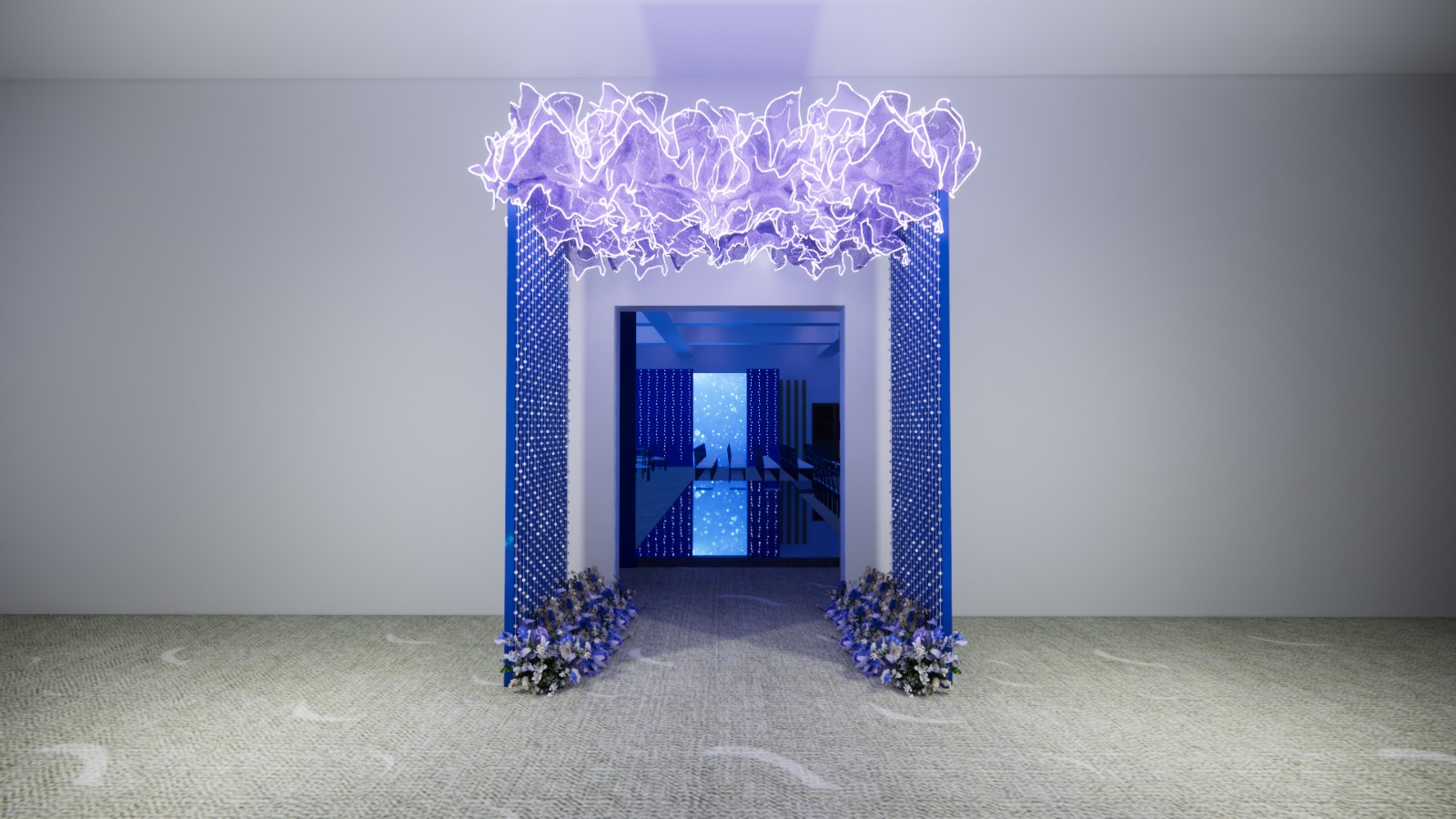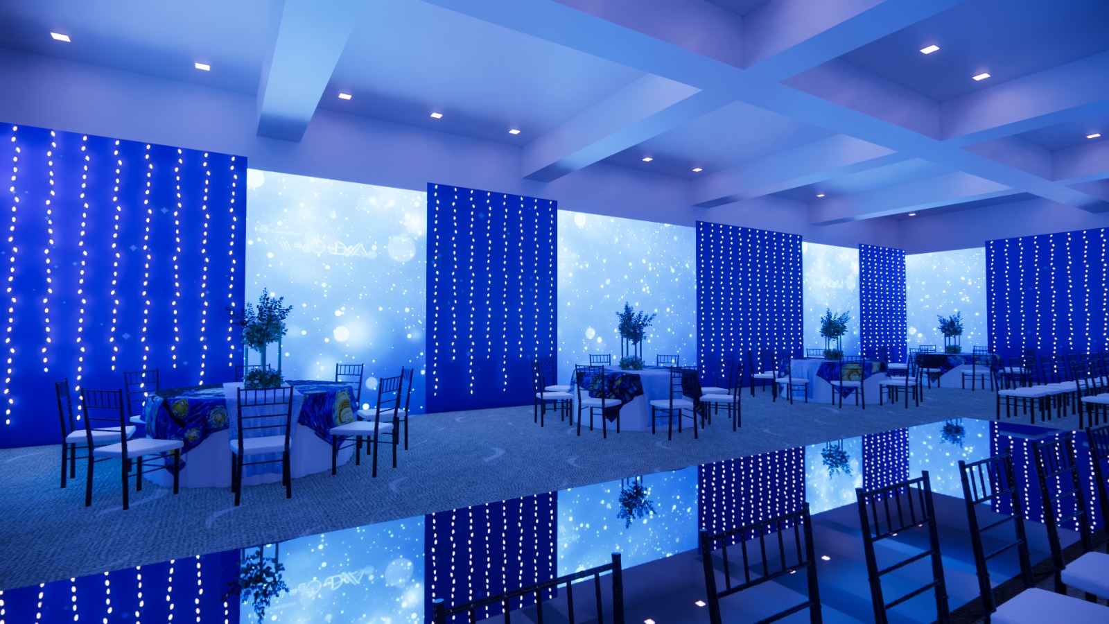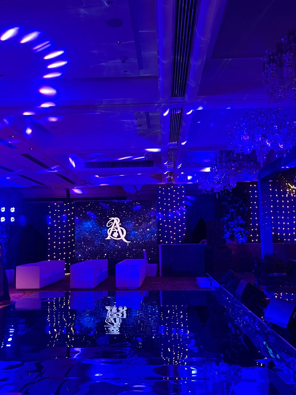 A complete venue transformation for a Sangeet celebration, designed around the poetic and immersive concept of a “Starry Night.” The design narrative focused on dissolving the spatial boundaries of a typical event hall, replacing them with a dynamic, atmospheric environment.